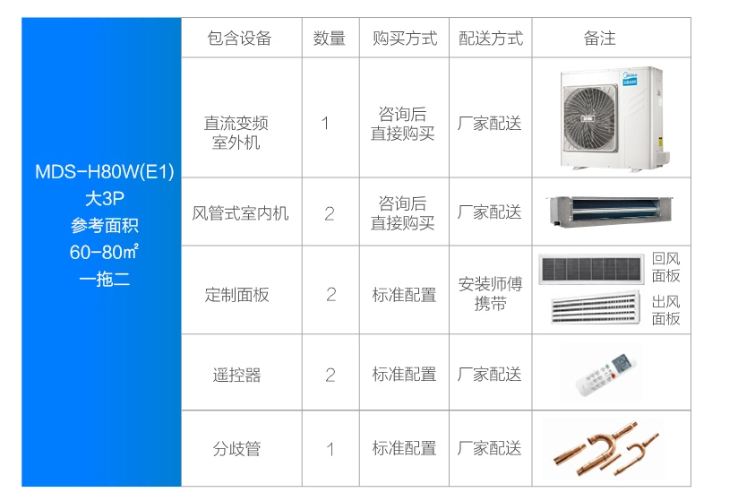 美的 一拖二變頻一級能效 多聯風管機 3匹 家用中央空調 MDS-H80W(E1)