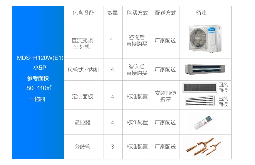 室外機(jī)安裝說(shuō)明書(shū)*1、室外機(jī)使用說(shuō)明書(shū)*1、室內(nèi)機(jī)使用說(shuō)明書(shū)*1、美的家庭中央空調(diào)安裝竣工報(bào)告書(shū)*1、出水管接管*1、網(wǎng)絡(luò)匹配線組*2、用戶服務(wù)指南*1、連接管(適用于16KW機(jī)型)、L型管(適用于10~14KW機(jī)型) |