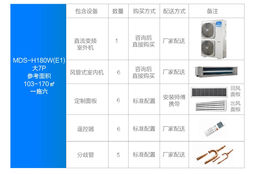 美的 一拖六變頻一級能效 多聯(lián)風(fēng)管機 7匹 家用中央空調(diào) MDS-H180W(E1)